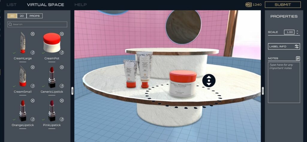 Once selected, models and props can be imported into Artemis, placed in a personalized library, which enables a simple drag-and-drop action, placing the products into the virtual store and adjusting them to size, to fit into the virtual space.